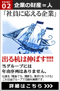 長い人生、結婚や子供などの大きな節目を迎えたときに、必ず欲しくなるのが安定と安心です。当グループは「今すぐ稼げる」だけではなく「ずっと稼げる」企業でありたいと思います。「安心して働ける企業」 当グループ社員の既婚率の高さがその証明です。